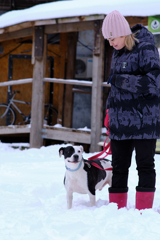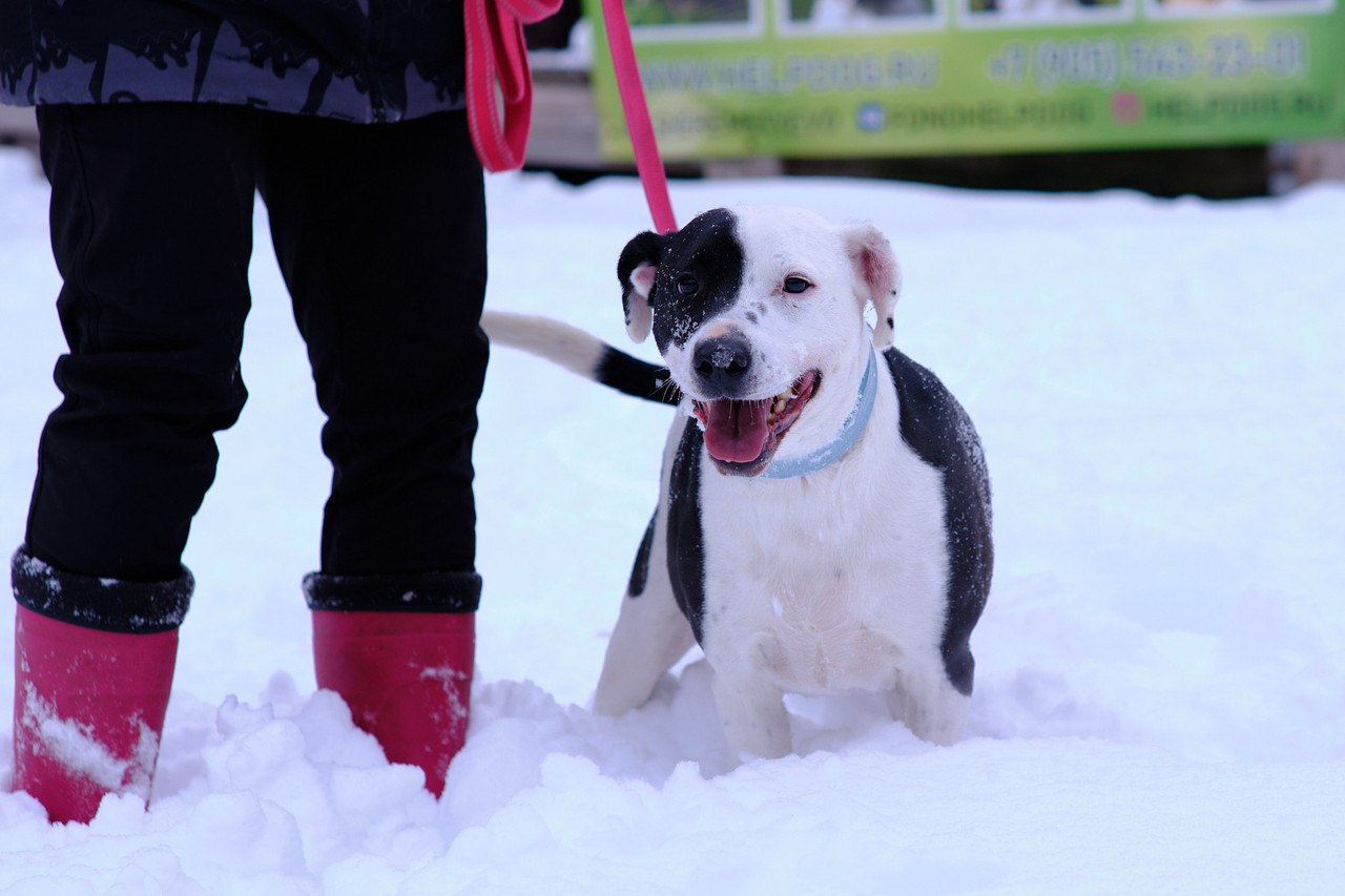 Белый Бим в приюте на прогулках с волонтёром.