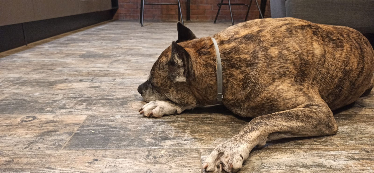 От хозяйки: "Пёс хочет жить на природе и чтобы у хозяина были вечные выходные, чтобы с ним быть всегда! Он просто сросся с хозяином, живёт только этим. Чует его за несколько минут до прихода. На даче даже в дождь ждёт на улице. Возле машины сидит, лежит ждёт, если кожаный ушёл. Они одно целое, дополняют друг друга. Полосатый включил зимний режим. Гуляет только на клумбу и домой, мы дольше выходим из дома, чем гуляем. Его ещё раздражают снег и дождь и грязные газоны, он лапы пачкать не хочет. По дорожке ходит, потом на клумбу, но я там убираю."