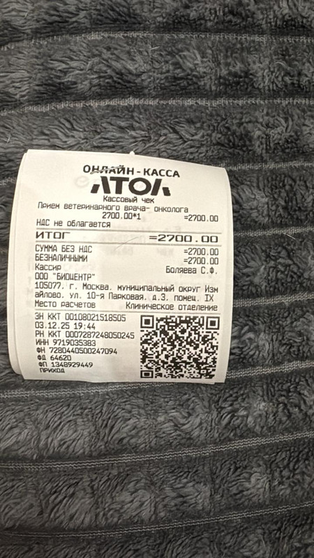 Чек за консультацию у онколога по Камраду. Оплатил приют.