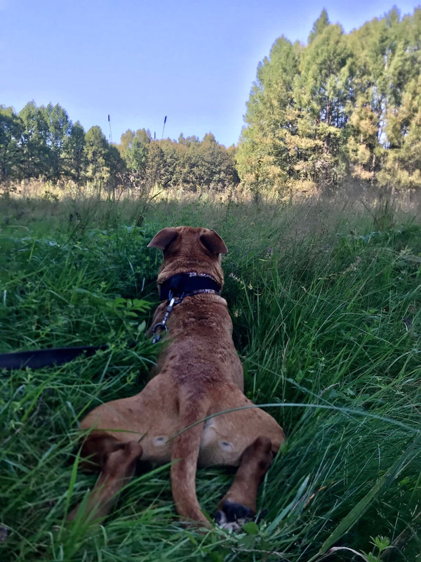 . На поле были какие-то замеры и несколько незнакомых людей, которые на нас косо посматривали. Ну и он косо посматривал на них и от меня не отходил.